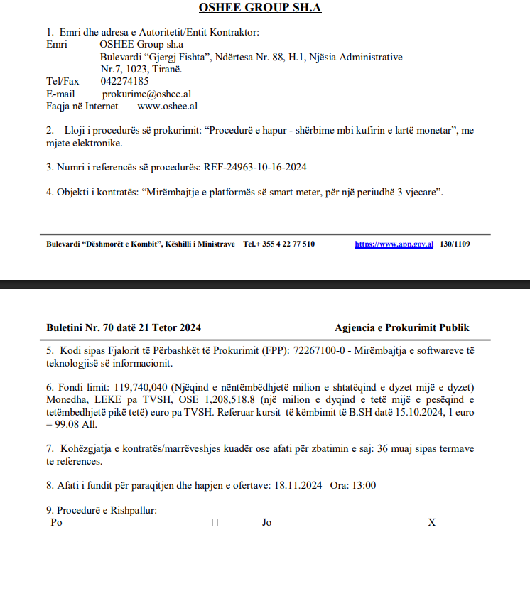 | Procuring Authority / Buyer | Tender object | Mirëmbajtje e platformës së smart meter, për një periudhë 3 vjecare | |